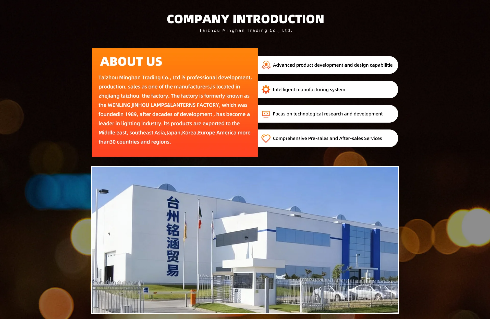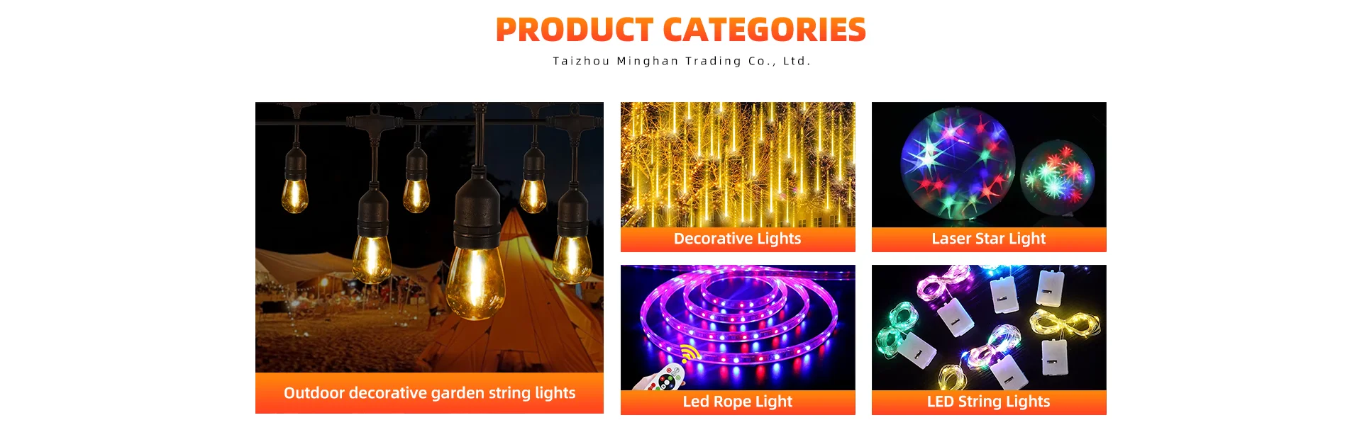 מוצרים עיקרייםאורות חג המולד, עבודות יד, מנורות, מנורת גינה, אור הנדסה חיצונית